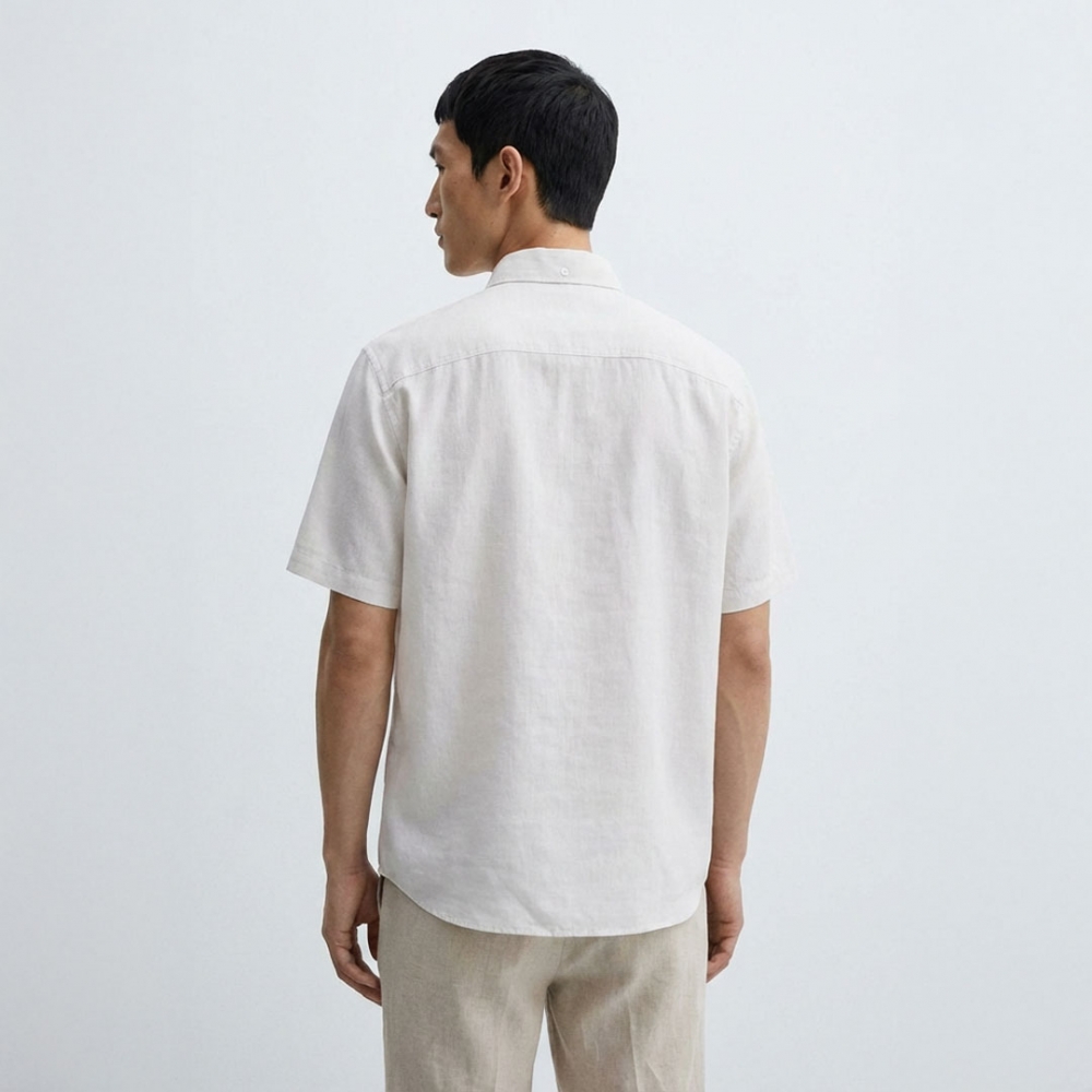 Nenhuma outra camisa no universo da moda foi tão imitada quanto as camisas com gola button down, estilo originado na Inglaterra no século XIX para manter a gola presa durante as partidas de polo e por atletas de outros esportes. A gola também apresenta um botão na parte traseira, que impede que ela levante — uma técnica de costura que alcançou seu auge nas décadas de 1950 e 1960. A carcela possui botões perolados e um botão frontal no bolso em vermelho, todos fabricados no Brasil.